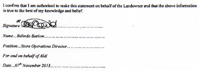 The motorist called Aldi to find why the witness statement was in the name of Belinda Barlow, store operations director, but signed by someone else. There was a clear 'pp' by the signature.